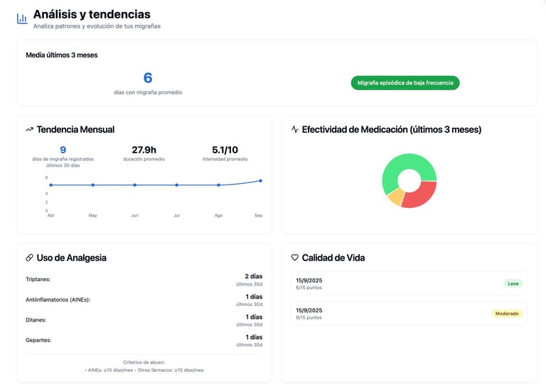 Visión global: ofrece gráficos y estadísticas que permiten ver la evolución de tu migraña en el tiempo.