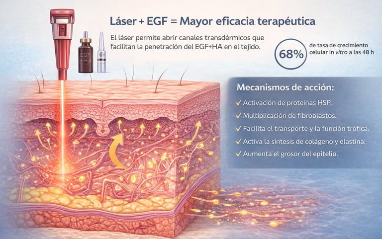 Trabajamos con tecnología de BeNuren©: una plataforma de láser de diodo diseñada para ginecología regenerativa y funcional, cuyo mecanismo se basa en aplicar calor controlado en la zona tratada para favorecer la regeneración del colágeno y mejorar propiedades del tejido (elasticidad, hidratación y soporte). Tras el láser, aplicamos EGF + Ácido Hialurónico para potenciar la hidratación y el bienestar íntimo. Es un paso complementario pensado para nutrir el tejido y favorecer una sensación de mayor confort en las semanas posteriores, especialmente en cuadros de sequedad o atrofia leve-moderada.